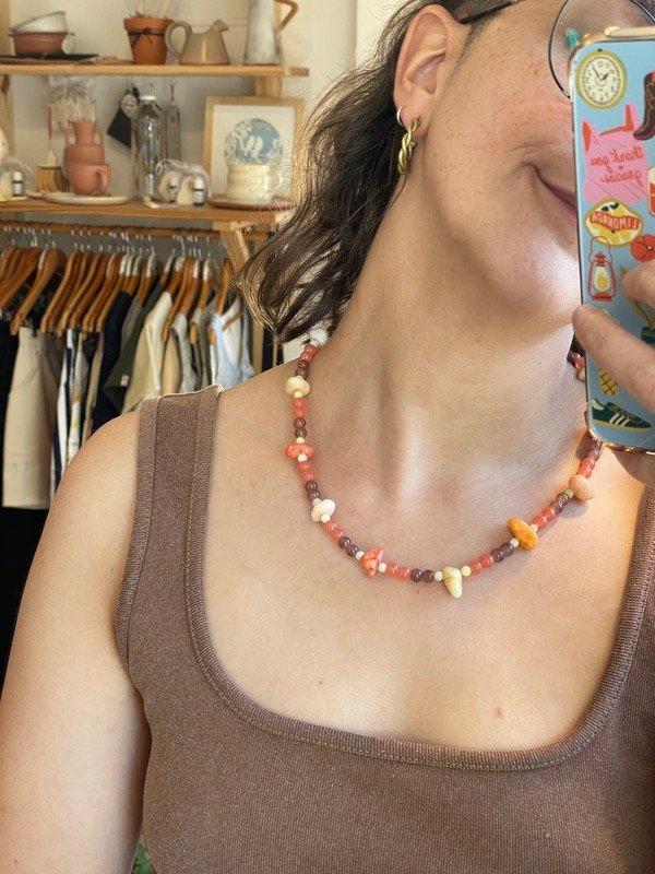 Collar hecho artesanalmente con perlas de vidrio y perlas de plástico.