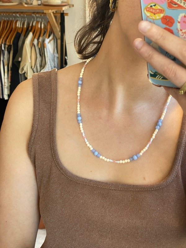 Collar hecho artesanalmente con perlas de vidrio y perlas de plástico.