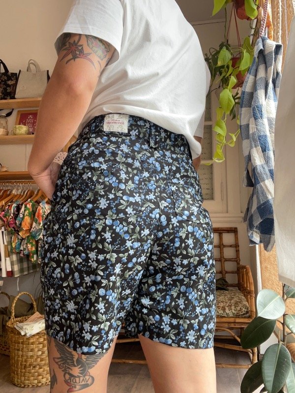 Se abrocha con un botón y ojal. Lleva las infaltables pinzas y pasa cintos.