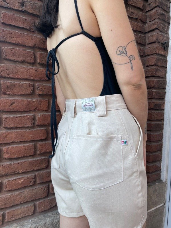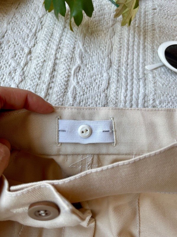 Se abrocha con un botón y ojal. Lleva las infaltables pinzas y pasa cintos.