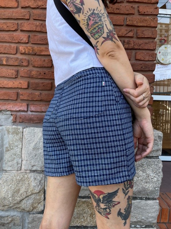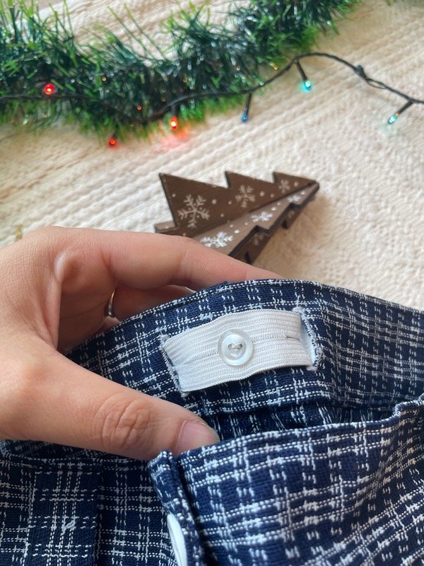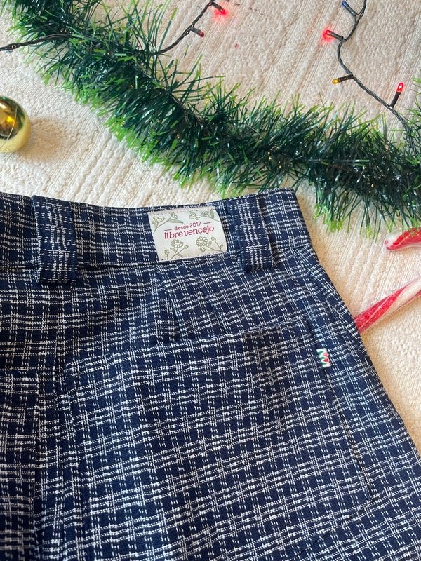 Se abrocha con un botón y ojal. Lleva las infaltables pinzas y pasa cintos.