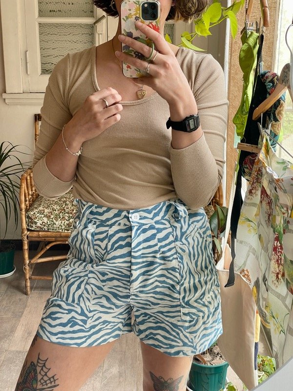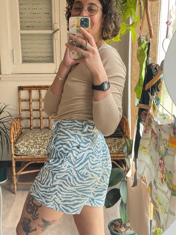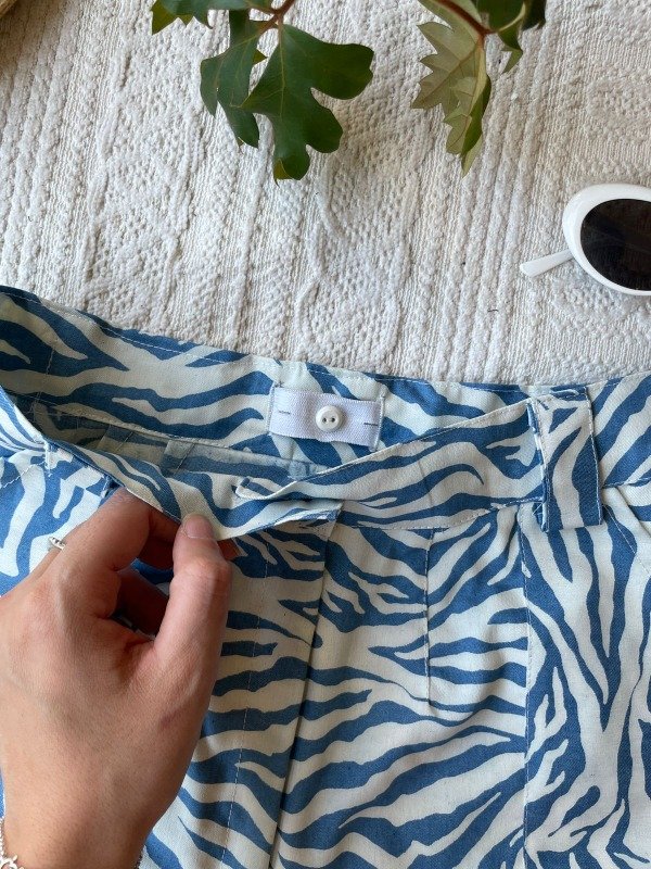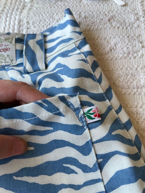Se abrocha con un botón y ojal. Lleva las infaltables pinzas y pasa cintos.