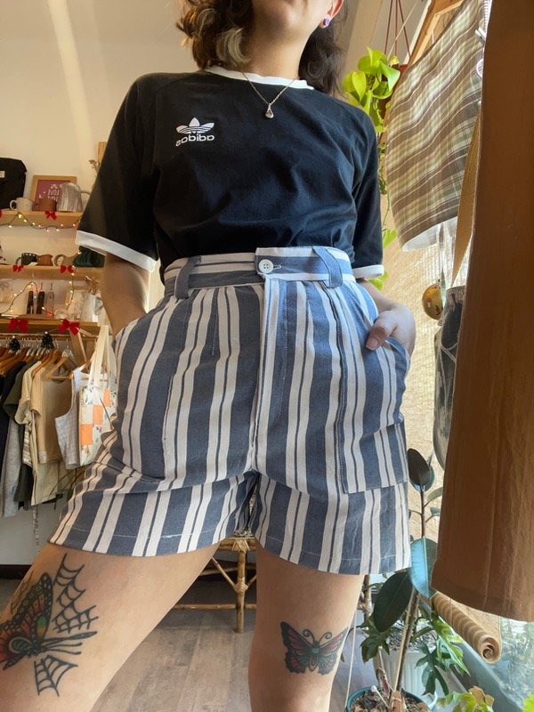 Se abrocha con un botón y ojal. Lleva las infaltables pinzas y pasa cintos.