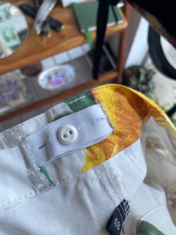 Se abrocha con un botón y ojal. Lleva las infaltables pinzas y pasa cintos.