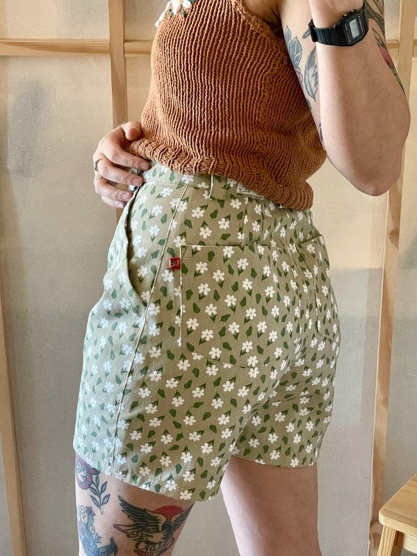 Se abrocha con un botón y ojal. Lleva las infaltables pinzas y pasa cintos.