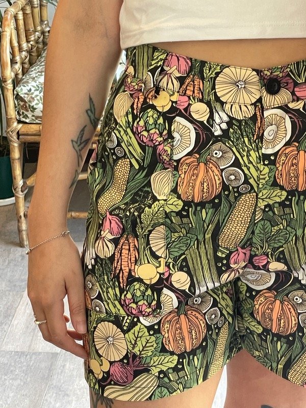 Se abrocha con un botón y ojal. Lleva las infaltables pinzas y pasa cintos.