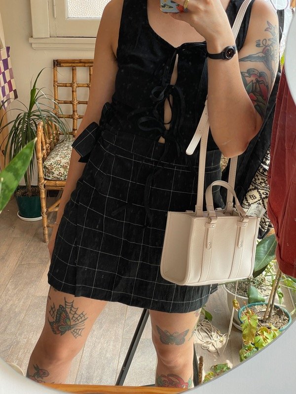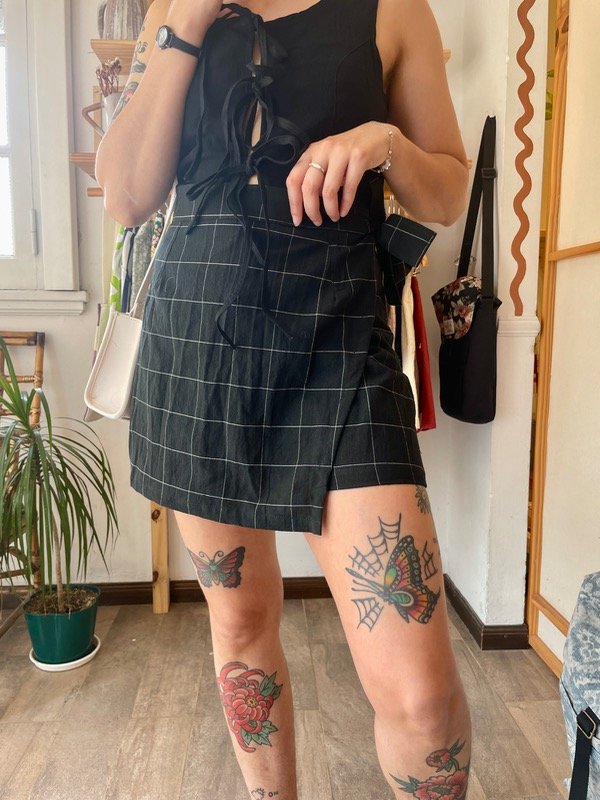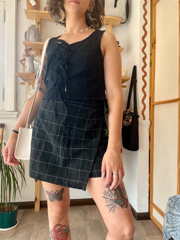 Para que sea una falda! sumamos una "media falda" con pinzas! y en la zona de la cintura un lazo, para que puedas atarla de costado.