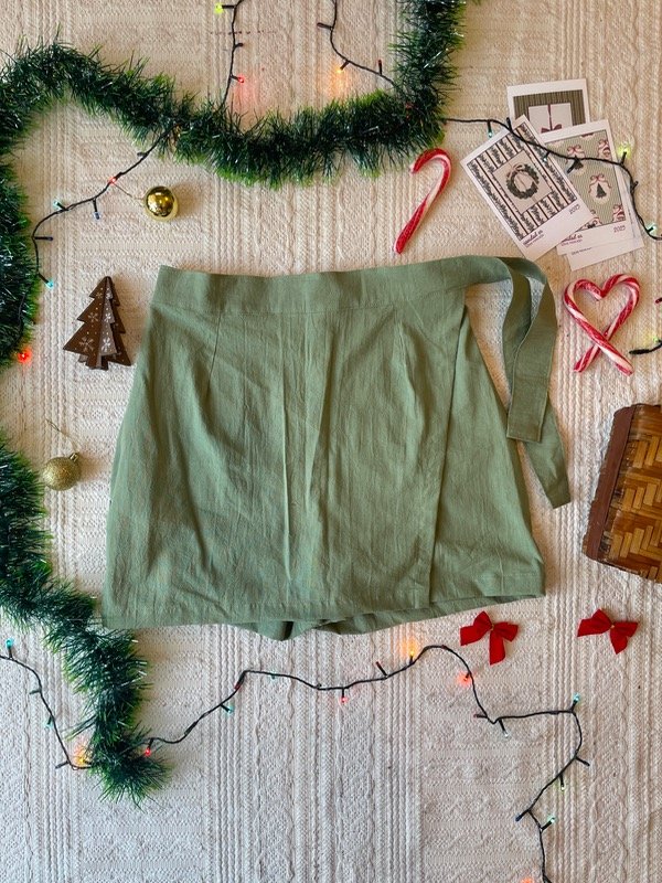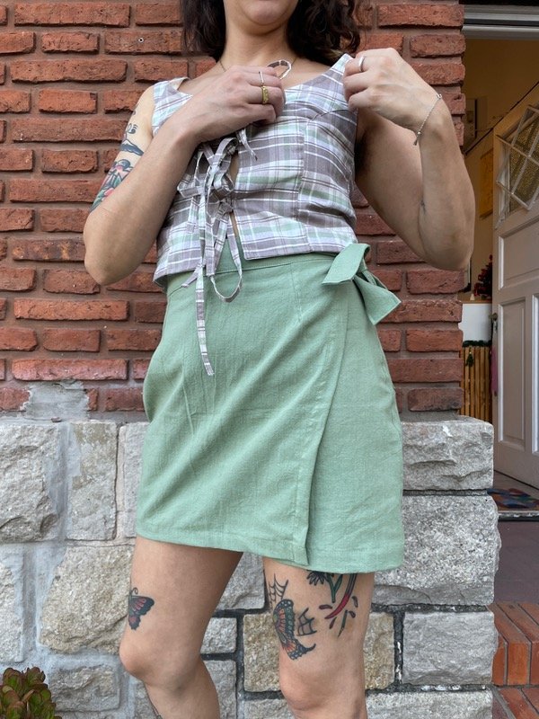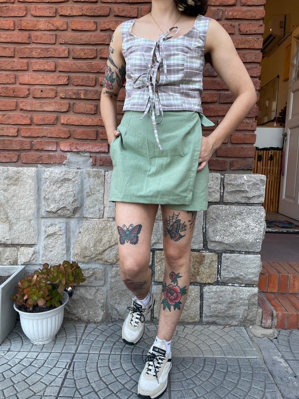 Para que sea una falda! sumamos una "media falda" con pinzas! y en la zona de la cintura un lazo, para que puedas atarla de costado.