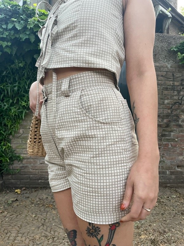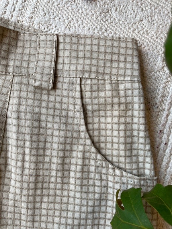 Se abrocha con un botón y ojal. Lleva las infaltables pinzas y pasa cintos.