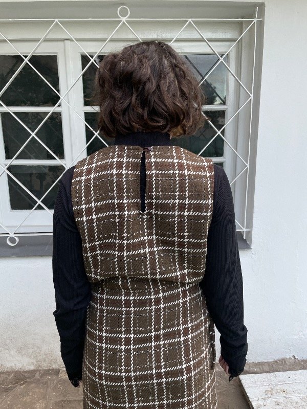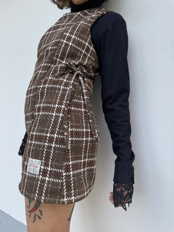 Además tiene dos bolsillos en la parte delantera y unas cintas de costado, echas con la misma tela, para armar unos moños y también sirven para ajustar y amoldarlo a tu gusto.